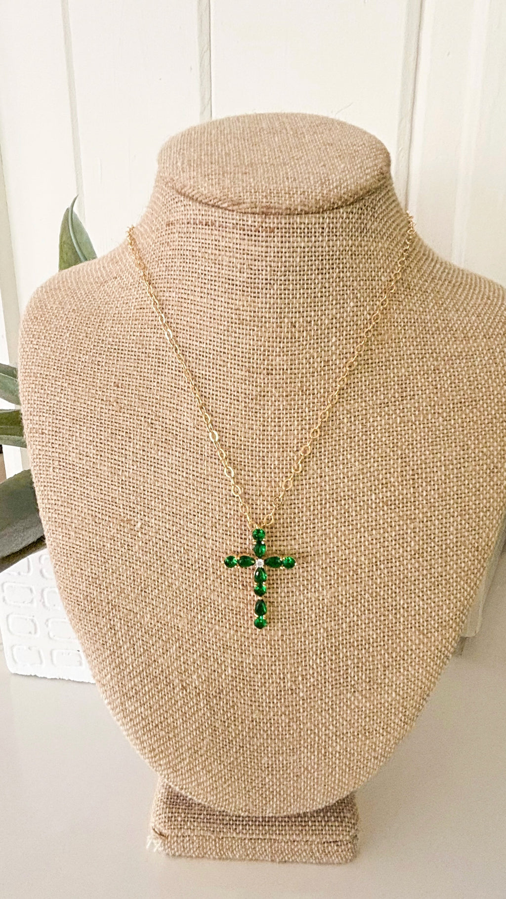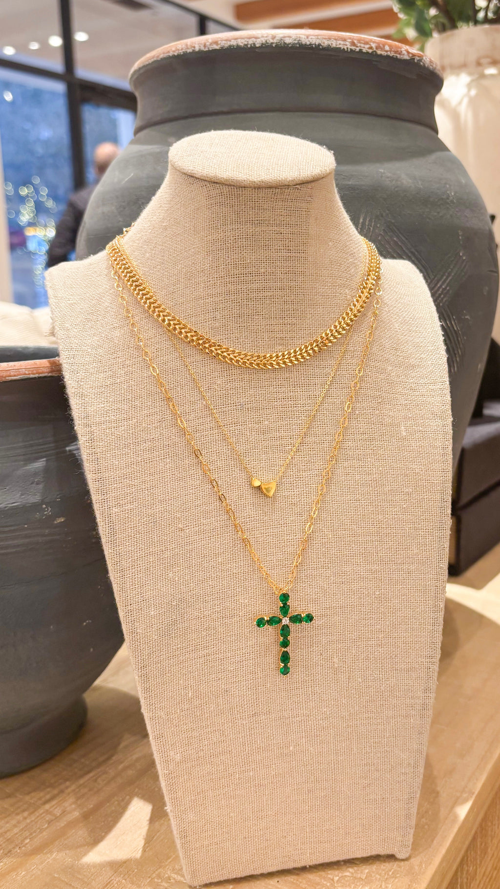An Emerald-inspired green stone cross pendant, suspends from a soft, dainty rolo chain. This piece brings a touch of vibrant color and timeless beauty, effortlessly elevating both everyday looks and special occasion outfits.