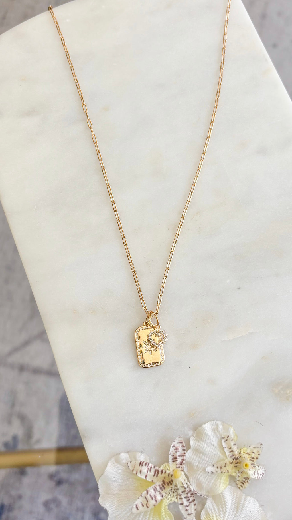A delicate and meaningful charm necklace featuring two elegant charms. The first is a sleek tag-style pendant engraved with a Octagram cubic zirconia star for a subtle sparkle. Paired with it is an open heart charm, also encrusted cz stones, symbolizing love and connection. Together, the charms hang gracefully on a fine paperclip chain, creating a timeless piece that blends personal sentiment with modern elegance.