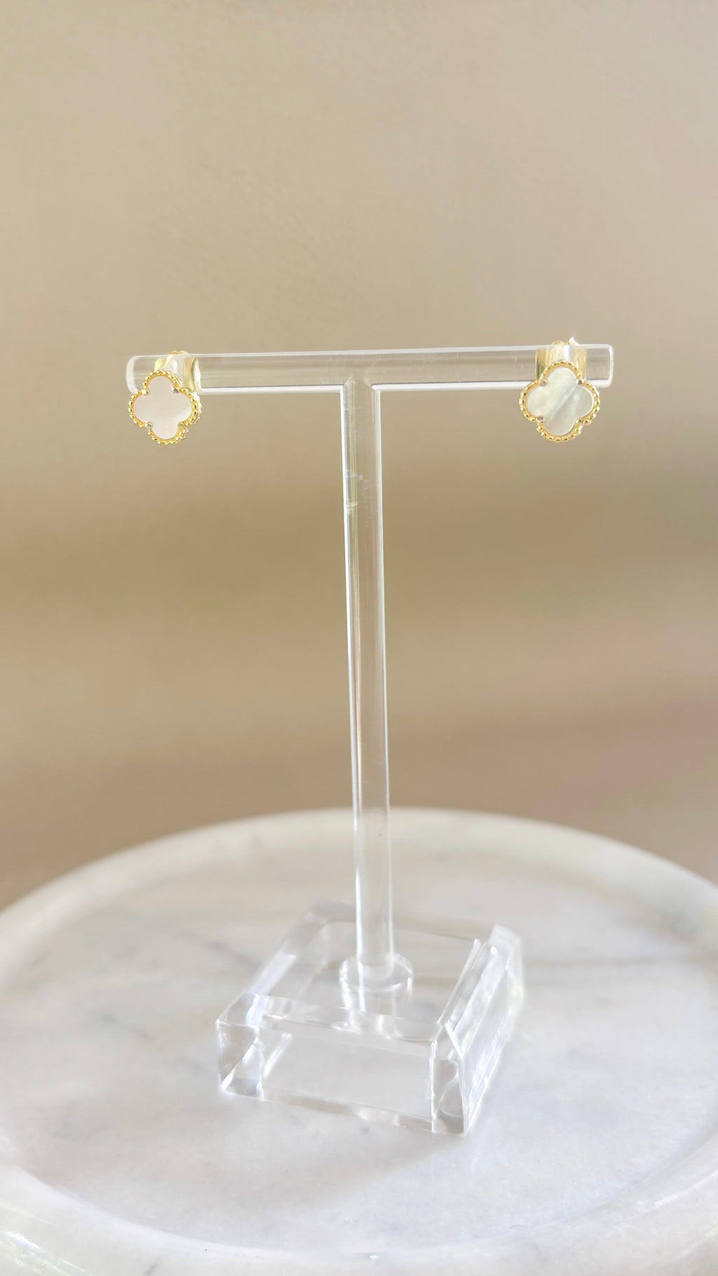 Elegant clover-shaped earrings featuring luminous Mother of Pearl inlays. Crafted in sterling silver with a 14k gold-plated finish for a timeless refined look. Perfect for everyday elegance.