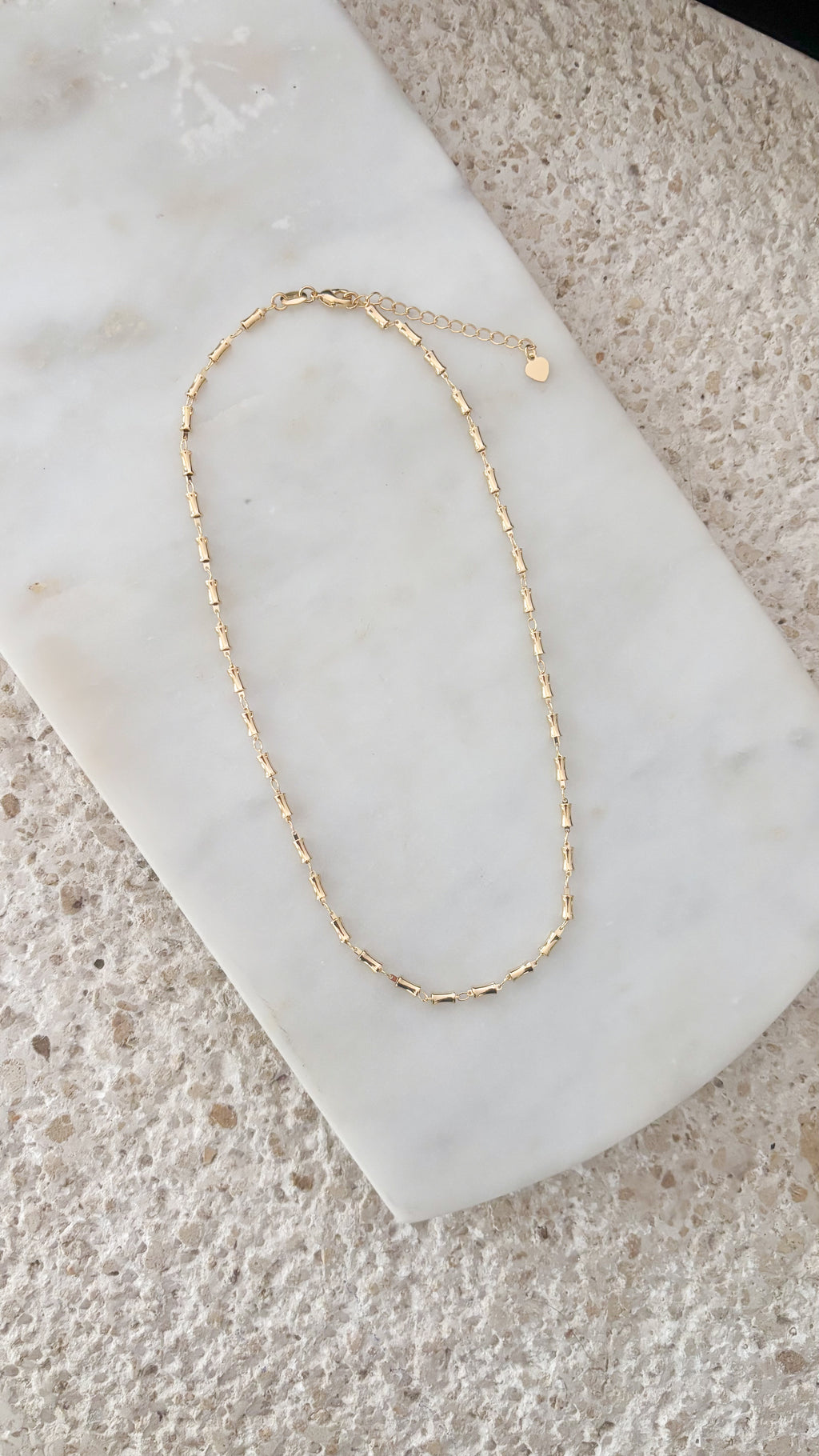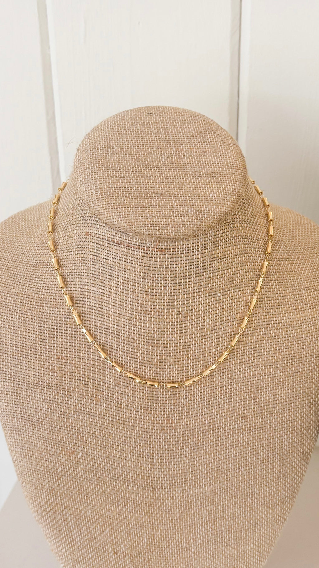 This necklace features elongated, smooth cylinder links spaced evenly along the chain. An oval link between each cylinder create a rhythmic balanced pattern. The oval links adds flexibility and movement. A refined and yet distinctive necklace that catches the light from multiple angles and works beautifully as a piece worn solo or a layered accent.