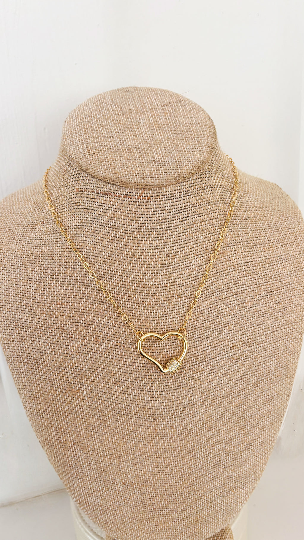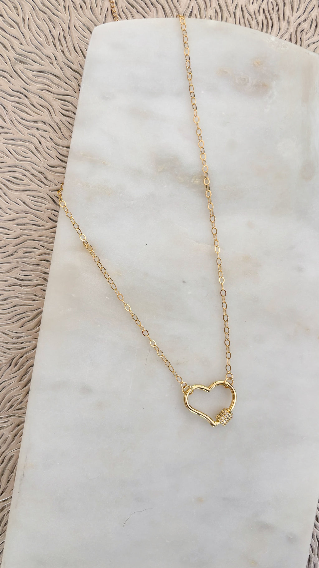 A gold-heart necklace with a sleek, radiant shine and delicate pave side accent for subtle sparkle. An airy, thin Rolo chain extends from both sides of the heart, enhancing the pendants elegant design. Wear it facing forward for a classic look or tilted on its side for a modern touch — you choose your look.