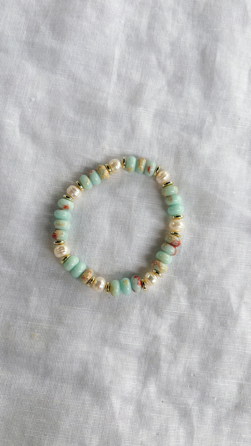 A serene and elegant stretch bracelet featuring aqua Sodalite beads, accented with scattered freshwater pearls and delicate gold-plated rounders. Lightweight and effortlessly chic, its layers beautifully with other pieces or shines on its own as a subtle statement. Perfect for everyday wear or adding a touch of refined sophistication to any outfit.