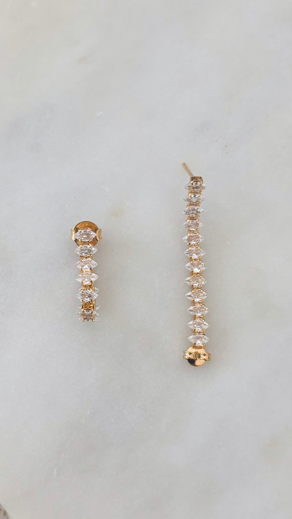 A striking modern earring crafted from a single fluid line of marquis-shaped cubic zirconia. Designed as one continuous piece, the chain of stones curves from the front of the ear and wraps elegantly around the back, securing with a butterfly fastening at the end. Refined yet contemporary, this design creates a seamless, sculptural look with brilliant sparkle from every angle.
