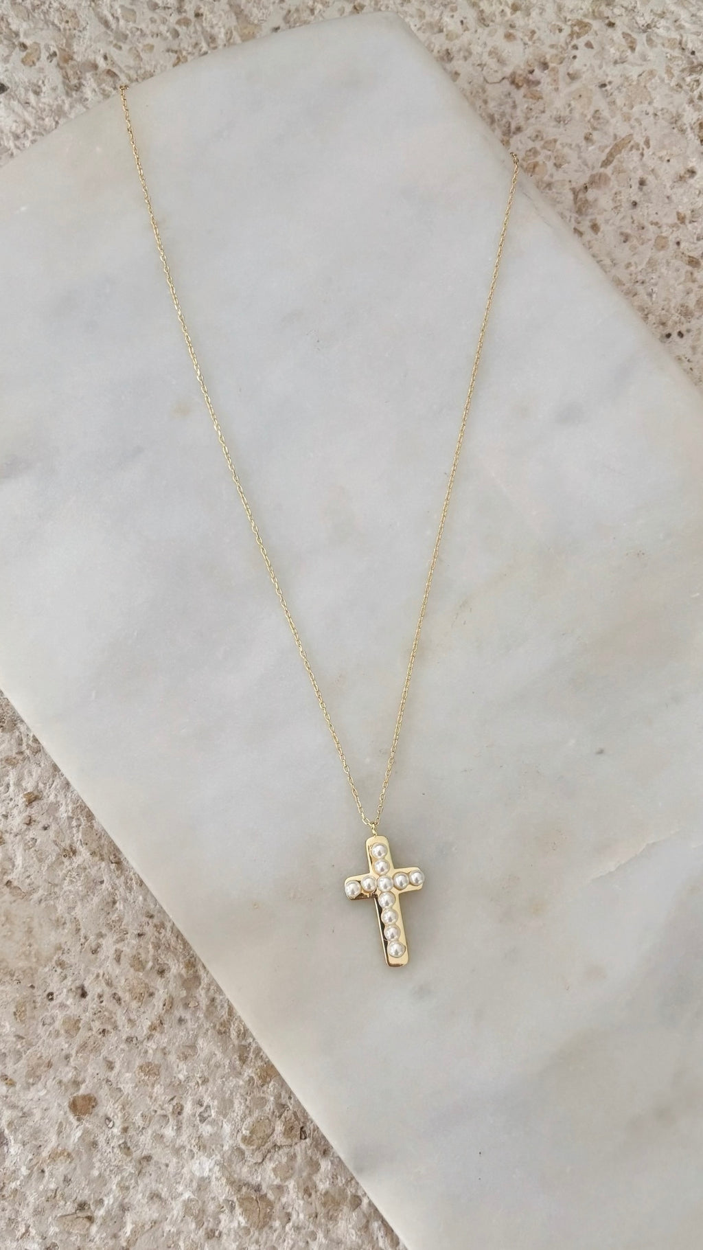 A radiant gold cross adorned with pearls set side by side, their gentle luster shaping a timeless symbol with modern softness that hangs from a dainty chain. Soft, elegant and timeless.