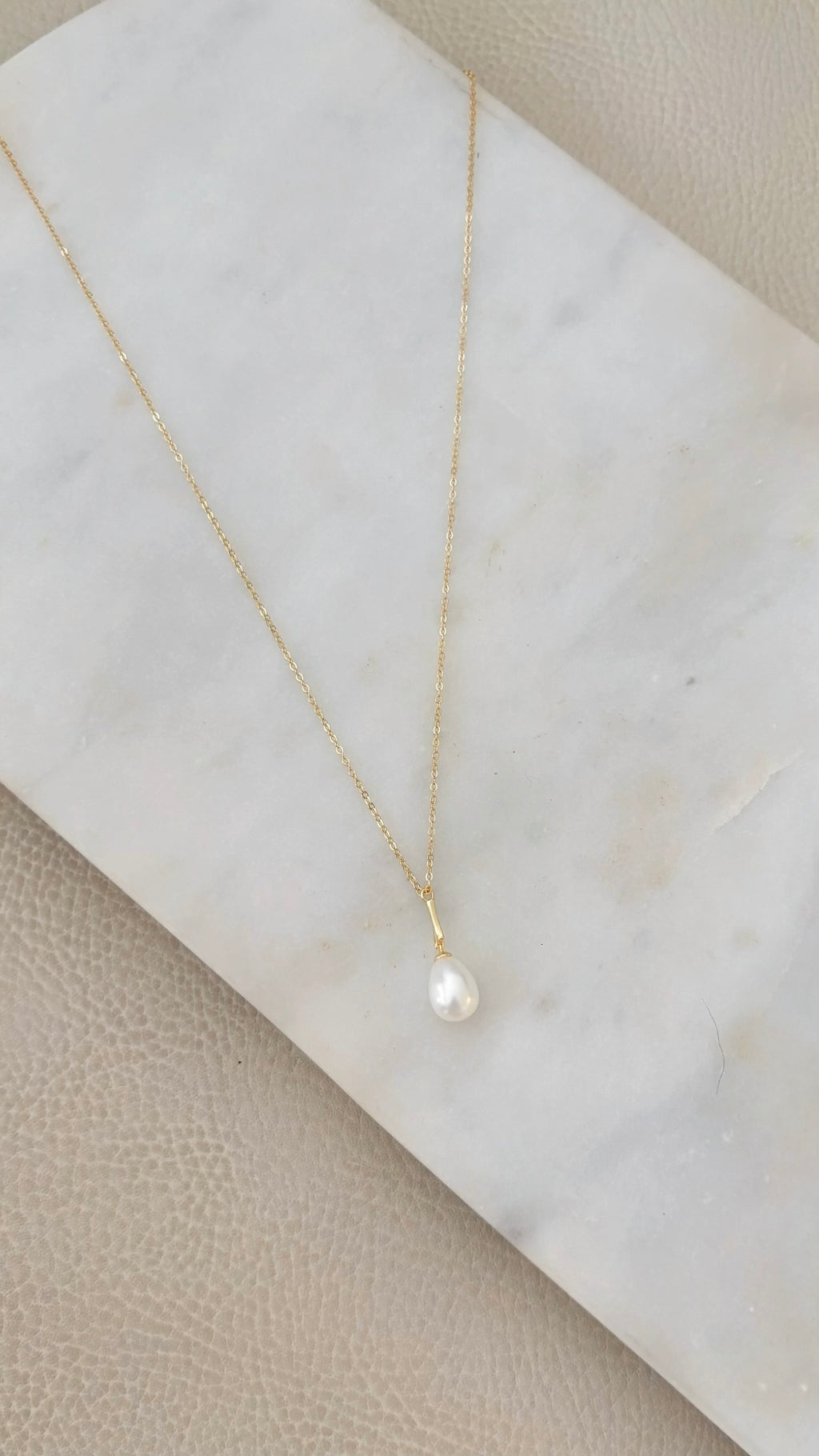 A single teardrop-shaped pearl delicately extends from a sleek tube accent, giving this necklace an elegant simplicity. Feminine and graceful, it rest beautifully against the chest, catching the light with every movement. A timeless classic, this single pearl necklace stands out through its understated elegance.