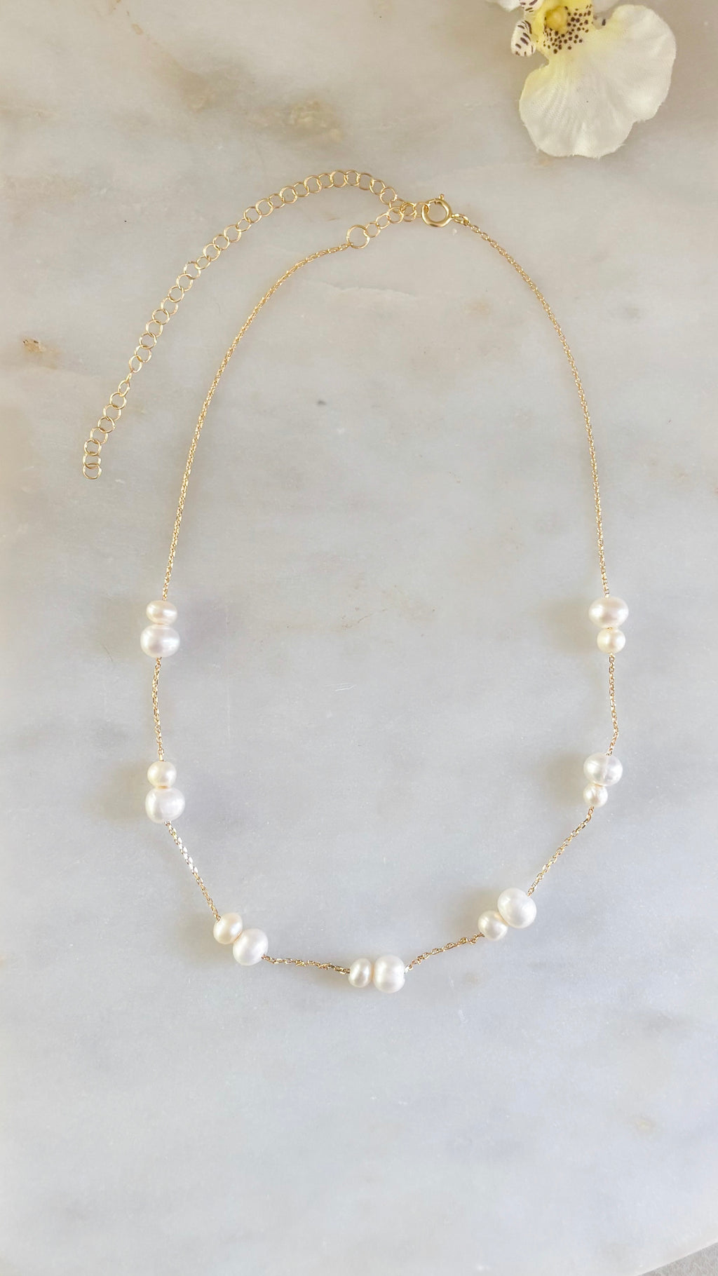Delicate and distinctive, this freshwater pearl necklace features a unique scattered pattern of individually placed pearls accented with elegant double-pearls spaced throughout. Crafted in Sterling silver with rich 14k gold plating, this piece brings a refined balance of modern minimalism and timeless charm.